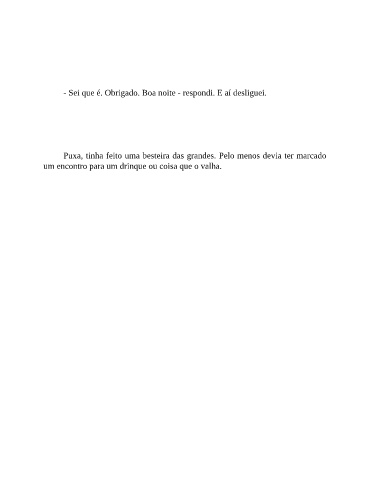 - Sei que é. Obrigado. Boa noite - respondi. E aí desliguei. Puxa, tinha feito uma besteira das grandes. Pelo menos devia ter marcado um encontro para um drinque ou coisa que o valha.