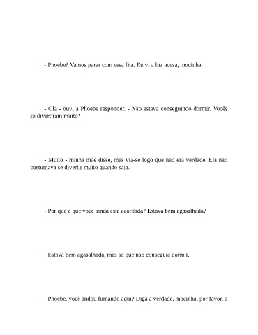 - Olá - ouvi a Phoebe responder. - Não estava conseguindo dormir. Vocês