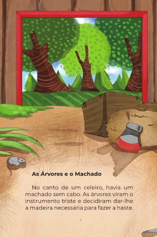 As Árvores e o Machado No canto de um celeiro, havia um machado sem cabo. As árvores viram o instrumento triste e decidiram dar-lhe a madeira necessária para fazer a haste. 7